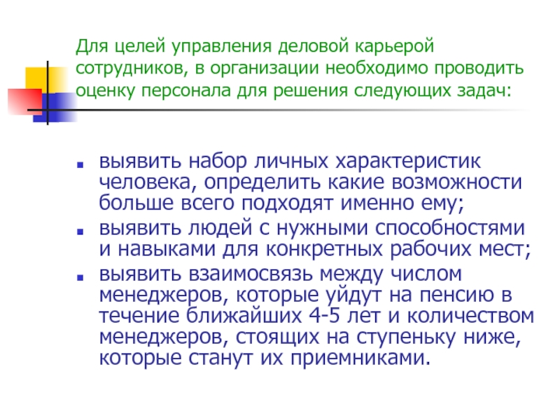 Слайд 42Для целей управления деловой карьерой сотрудников, в организации необходимо проводить