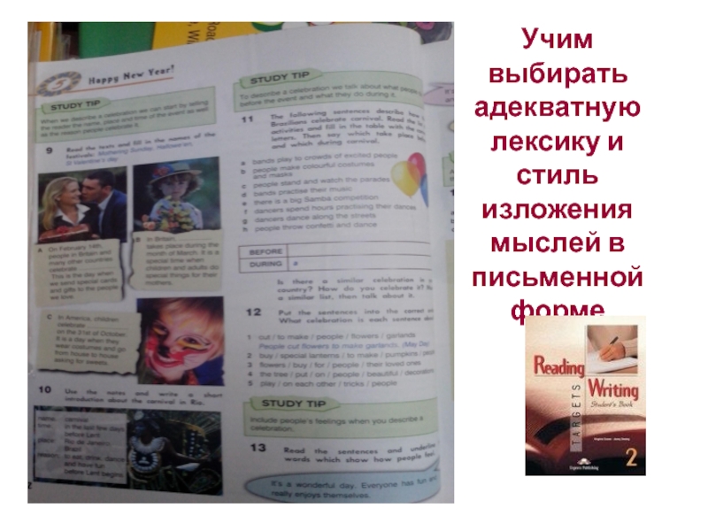 Слайд 12Учим выбирать адекватную лексику и стиль изложения мыслей в письменной