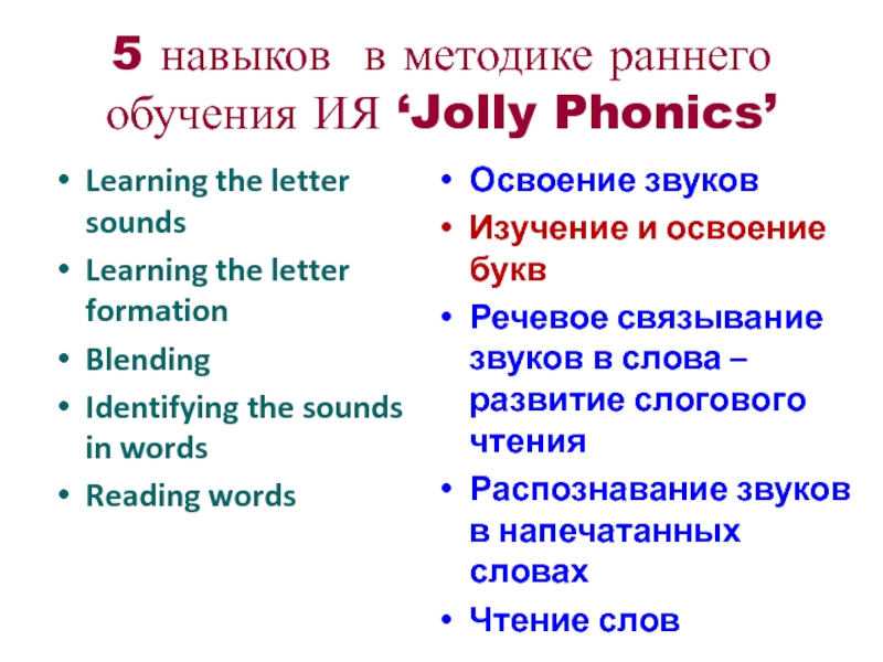 5 навыков в методике раннего обучения ИЯ ‘Jolly Phonics’Learning the letter soundsLearning the letter formationBlendingIdentifying the sounds
