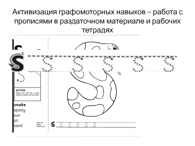 Слайд 8 Активизация графомоторных навыков – работа с прописями в раздаточном материале
