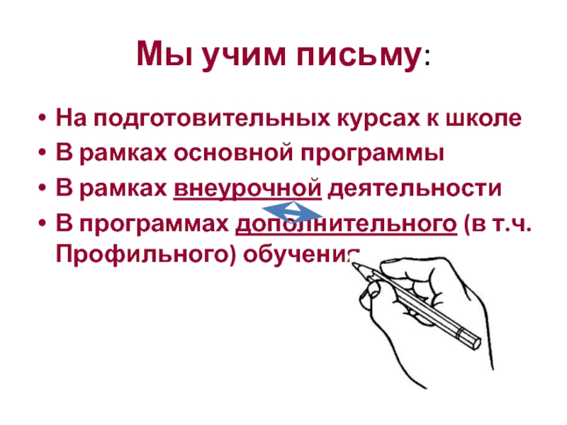 Мы учим письму:На подготовительных курсах к школеВ рамках основной программыВ рамках внеурочной деятельностиВ программах дополнительного (в т.ч. Профильного) обучения