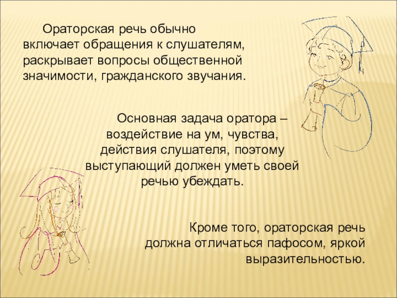 Слайд 25Ораторская речь обычно включает обращения к слушателям, раскрывает вопросы общественной