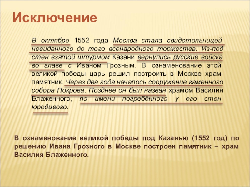 во главе с Иваном Грозным. В ознаменование этой великой победы царь решил построить в Москве храм-памятник. Через два года началось сооружение каменного собора Покрова. Позднее он был назван храмом Василия Блаженного, по имени погребённого у его стен юродивого.