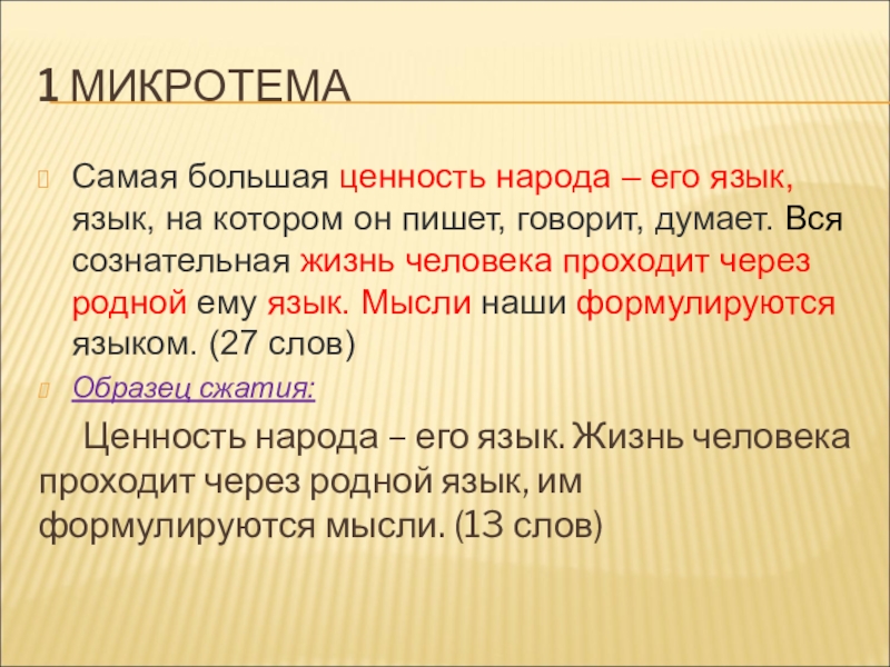 Ценность народа – его язык. Жизнь человека проходит через родной язык, им формулируются мысли. (13 слов)