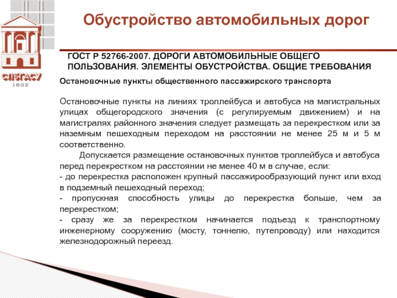 линиях троллейбуса и автобуса на магистральных улицах общегородского значения (с регулируемым движением) и на магистралях районного значения следует размещать за перекрестком или за наземным пешеходным переходом на расстоянии не менее 25 м и 5 м соответственно.