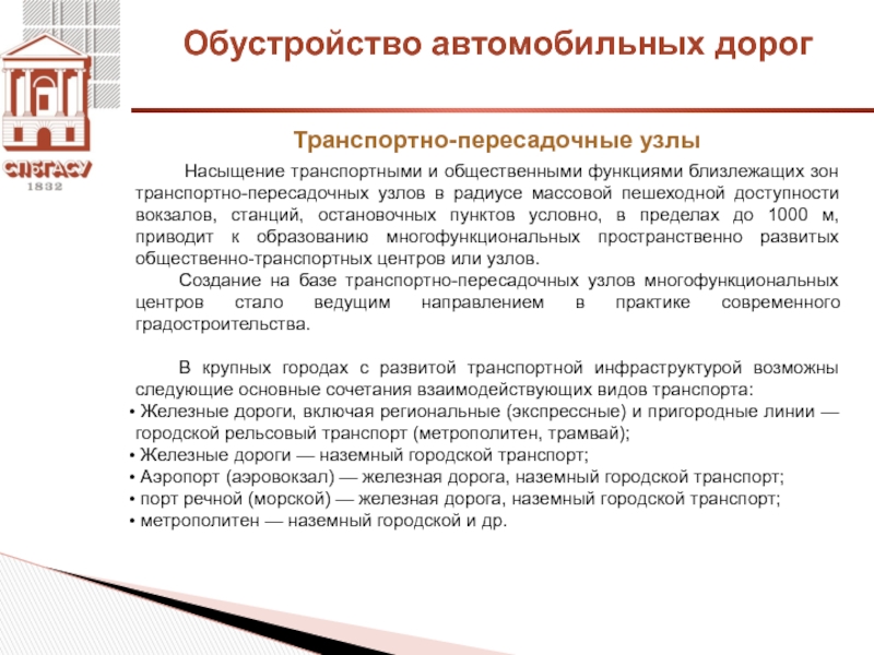 станций, остановочных пунктов условно, в пределах до 1000 м, приводит к образованию многофункциональных пространственно развитых общественно-транспортных центров или узлов.