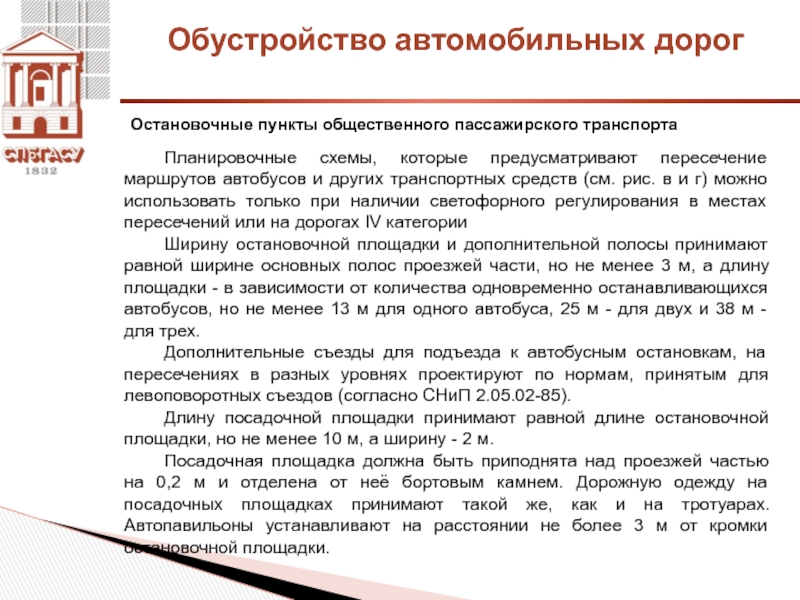 Посадочная площадка должна быть приподнята над проезжей частью на 0,2 м и отделена от неё бортовым камнем. Дорожную одежду на посадочных площадках принимают такой же, как и на тротуарах. Автопавильоны устанавливают на расстоянии не более 3 м от кромки остановочной площадки.
