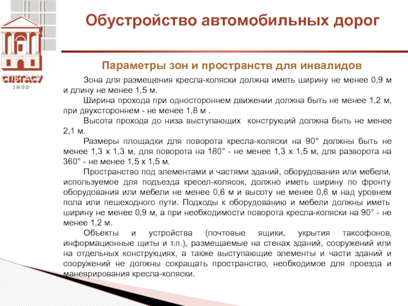 Объекты и устройства (почтовые ящики, укрытия таксофонов, информационные щиты и т.п.), размещаемые на стенах зданий, сооружений или на отдельных конструкциях, а также выступающие элементы и части зданий и сооружений не должны сокращать пространство, необходимое для проезда и маневрирования кресла-коляски.
