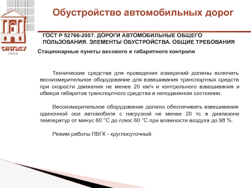 ПВГК оборудуют помещениями для размещения персонала, площадками для проведения измерений весовых и габаритных параметров автомобилей, стоянкой для автомобилей, техническими средствами проведения измерений, хранения и анализа данных, полученных в результате измерений.