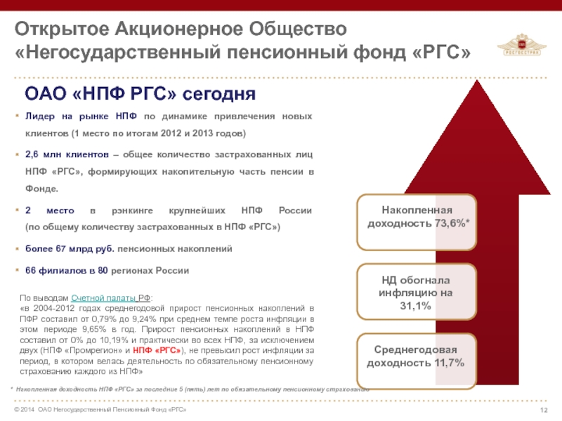 Среднегодовая доходность ОАО «НПФ РГС» составляет 11,7%.