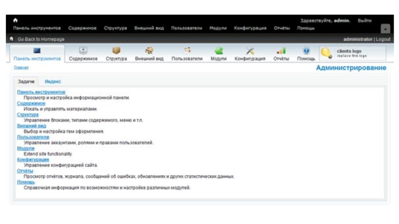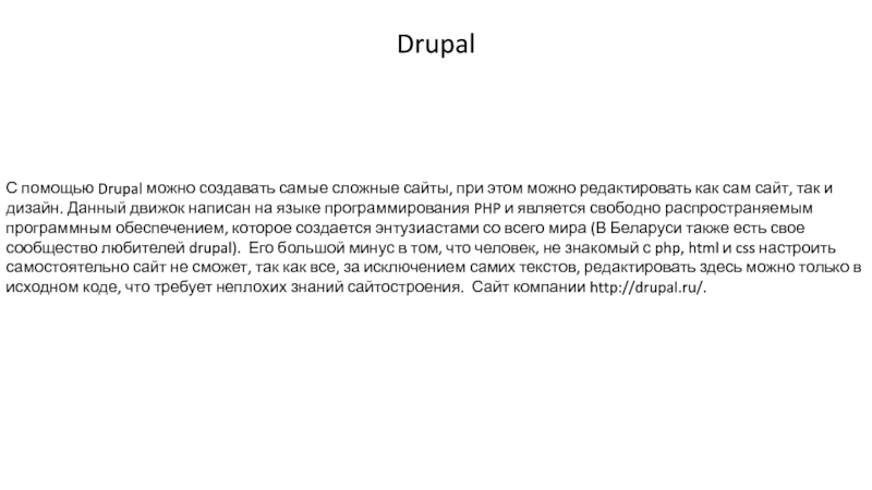 написан на языке программирования PHP и является свободно распространяемым программным обеспечением, которое создается энтузиастами со всего мира (В Беларуси также есть свое сообщество любителей drupal). Его большой минус в том, что человек, не знакомый с php, html и css настроить самостоятельно сайт не сможет, так как все, за исключением самих текстов, редактировать здесь можно только в исходном коде, что требует неплохих знаний сайтостроения. Сайт компании http://drupal.ru/.