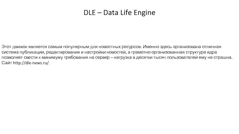 настройки новостей, а грамотно организованная структура ядра позволяет свести к минимуму требования на сервер – нагрузка в десятки тысяч пользователей ему не страшна. Сайт http://dle-news.ru/.