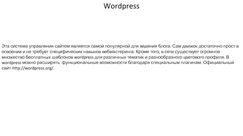 навыков вебмастеринга. Кроме того, в сети существует огромное множество бесплатных шаблонов wordpress для различных тематик и разнообразного цветового профиля. В wordpress можно расширять функциональные возможности благодаря специальным плагинам. Официальный сайт http://wordpress.org/.