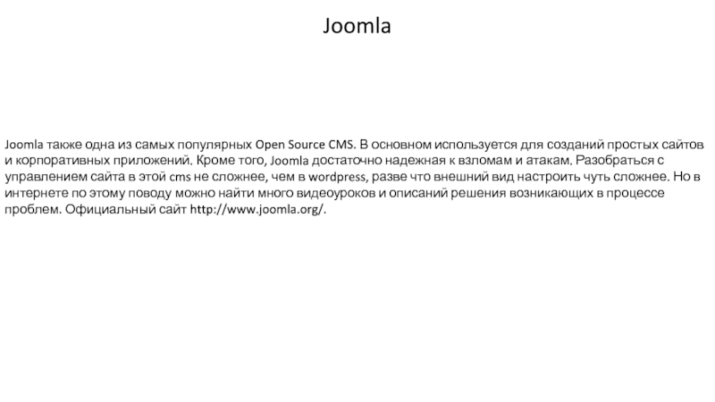 того, Joomla достаточно надежная к взломам и атакам. Разобраться с управлением сайта в этой cms не сложнее, чем в wordpress, разве что внешний вид настроить чуть сложнее. Но в интернете по этому поводу можно найти много видеоуроков и описаний решения возникающих в процессе проблем. Официальный сайт http://www.joomla.org/.