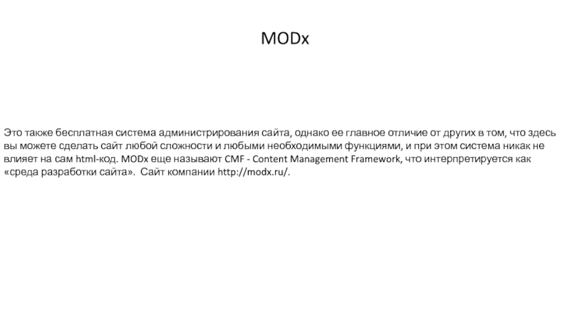 любой сложности и любыми необходимыми функциями, и при этом система никак не влияет на сам html-код. MODx еще называют CMF - Content Management Framework, что интерпретируется как «среда разработки сайта». Сайт компании http://modx.ru/.