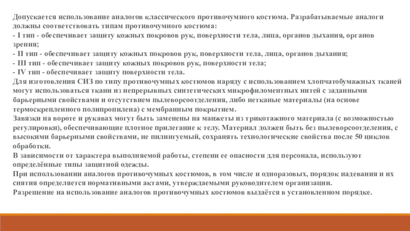 Слайд 8Допускается использование аналогов классического противочумного костюма. Разрабатываемые аналоги должны соответствовать