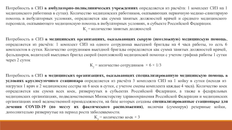 Потребность в СИЗ в медицинских организациях, оказывающих специализированную медицинскую помощь в условиях круглосуточного стационара определяется из расчёта 3 комплекта СИЗ на 1 койку в сутки (исходя из нагрузки 1 врач и 2 медицинские сестры на 6 коек в сутки, с учетом смены комплекта каждые 4 часа). Количество коек определяется как сумма всех коек, развернутых в субъектах Российской Федерации, а также в федеральных медицинских организациях, подведомственных Министерству здравоохранения Российской Федерации и медицинских организациях иной ведомственной принадлежности, на базе которых созданы специализированные стационары для лечения COVID-19 (по месту их фактического расположения), включая (суммируя) резервные койки, дополнительно развернутые на период роста заболеваемости.