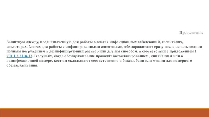 использования полным погружением в дезинфицирующий раствор или другим способом, в соответствии с приложением 1 СП 1.3.3118-13. В случаях, когда обеззараживание проводят автоклавированием, кипячением или в дезинфекционной камере, костюм складывают соответственно в биксы, баки или мешки для камерного обеззараживания.