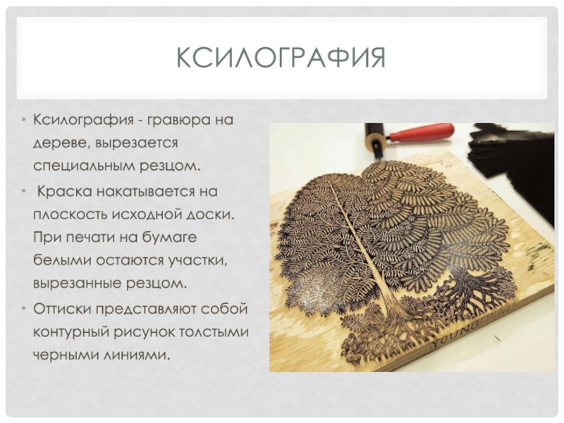 Ксилография - гравюра на дереве, вырезается специальным резцом.