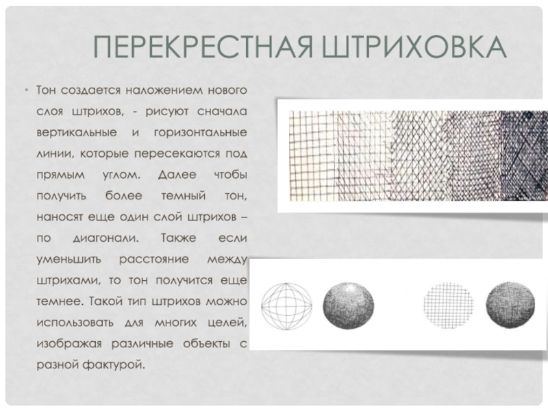 чтобы получить более темный тон, наносят еще один слой штрихов – по диагонали. Также если уменьшить расстояние между штрихами, то тон получится еще темнее. Такой тип штрихов можно использовать для многих целей, изображая различные объекты с разной фактурой.