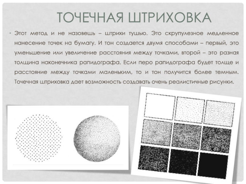 способами – первый, это уменьшение или увеличение расстояния между точками, второй – это разная толщина наконечника рапидографа. Если перо рапидографа будет толще и расстояние между точками маленьким, то и тон получится более темным. Точечная штриховка дает возможность создавать очень реалистичные рисунки.
