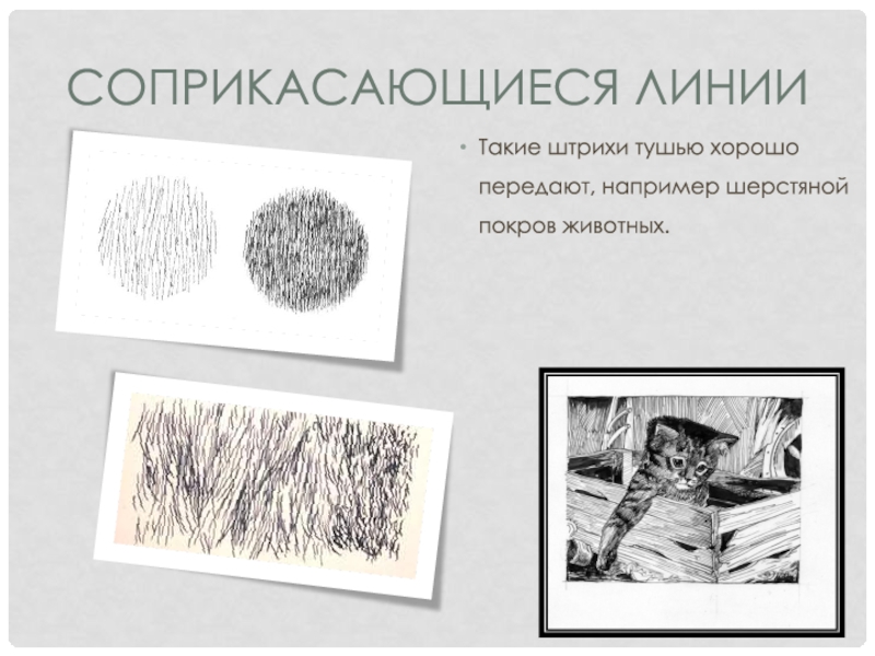Такие штрихи тушью хорошо передают, например шерстяной покров животных.