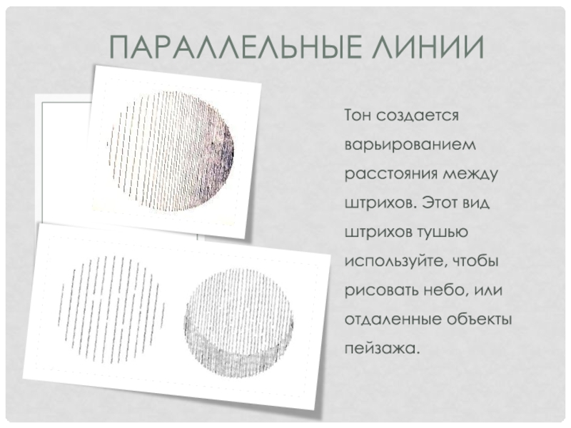 Слайд 20Тон создается варьированием расстояния между штрихов. Этот вид штрихов тушью