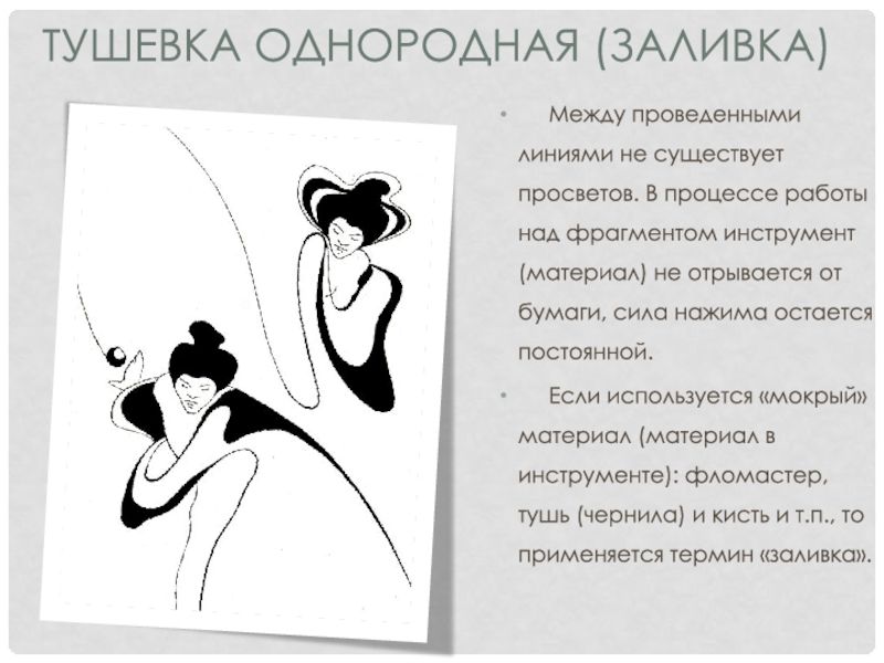 Если используется «мокрый» материал (материал в инструменте): фломастер, тушь (чернила) и кисть и т.п., то применяется термин «заливка».