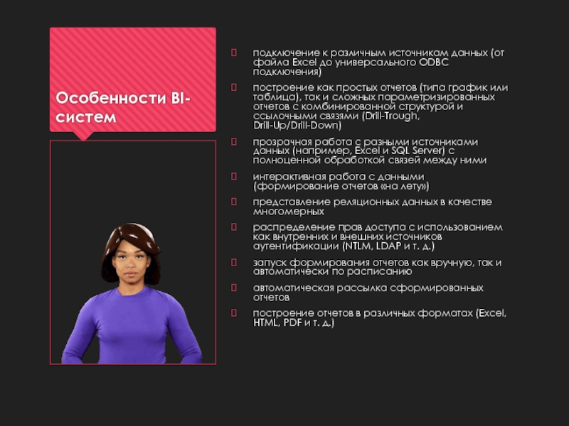 Особенности BI-системподключение к различным источникам данных (от файла Excel до универсального ODBC подключения) построение как простых отчетов (типа