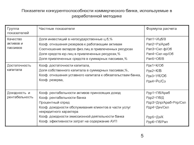 Слайд 5Показатели конкурентоспособности коммерческого банка, используемые в разработанной методике