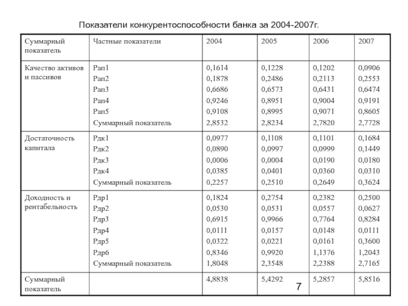 Слайд 7Показатели конкурентоспособности банка за 2004-2007г.