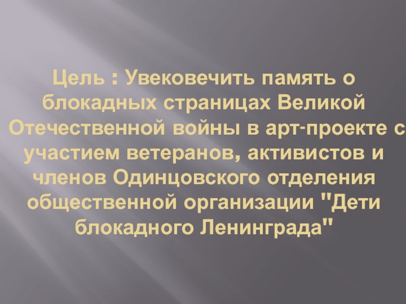 Цель : Увековечить память о блокадных страницах Великой Отечественной войны в арт-проекте с участием ветеранов, активистов и