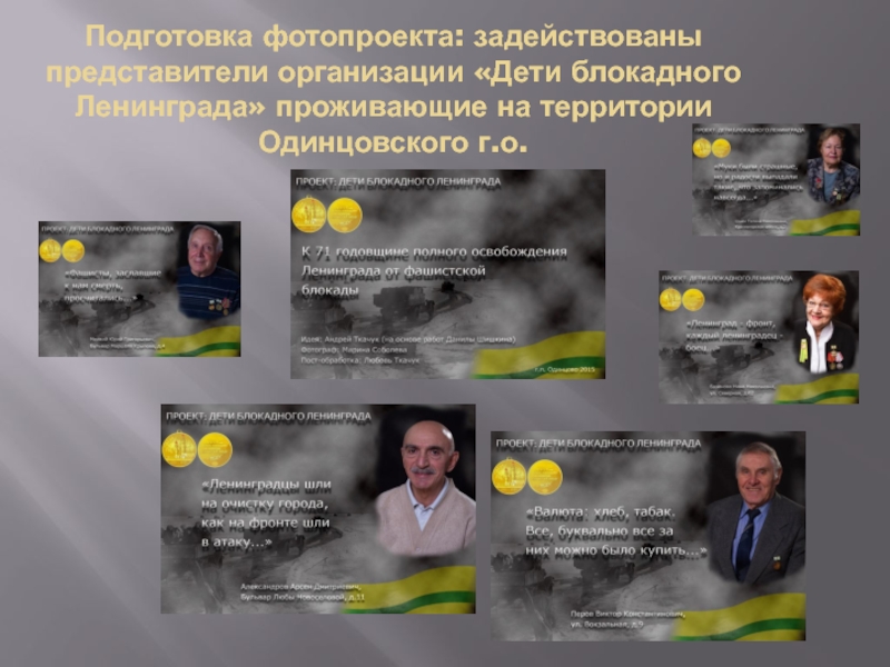Слайд 4Подготовка фотопроекта: задействованы представители организации «Дети блокадного Ленинграда» проживающие на