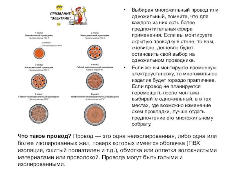проводку в стене, то вам, очевидно, дешевле будет остановить свой выбор на одножильном проводнике.Если же вы монтируете временную электроустановку, то многожильное изделие будет гораздо практичнее. Если провод не планируется перемещать после монтажа – выбирайте одножильный, а в тех местах, где возможно изменение схем прокладки, лучше отдать предпочтение его многожильному собрату.