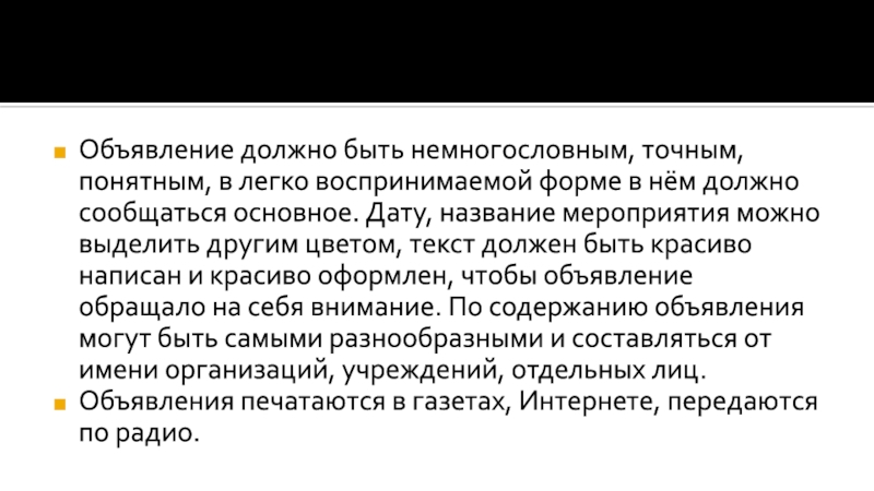 Слайд 11Объявление должно быть немногословным, точным, понятным, в легко воспринимаемой форме