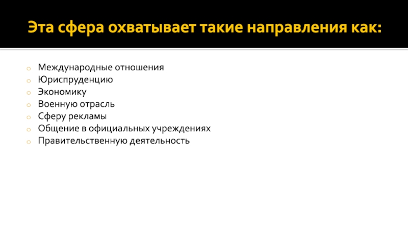 Эта сфера охватывает такие направления как:Международные отношенияЮриспруденциюЭкономикуВоенную отрасльСферу рекламыОбщение в официальных учрежденияхПравительственную деятельность