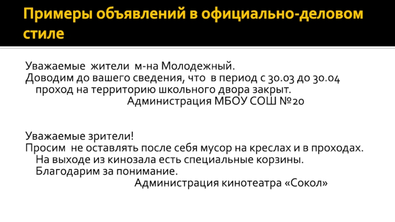 Примеры объявлений в официально-деловом стиле Уважаемые жители м-на Молодежный.Доводим до вашего сведения, что в период с 30.03