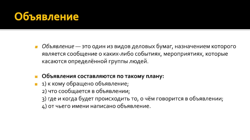 Объявление — это один из видов деловых бумаг, назначением которого является