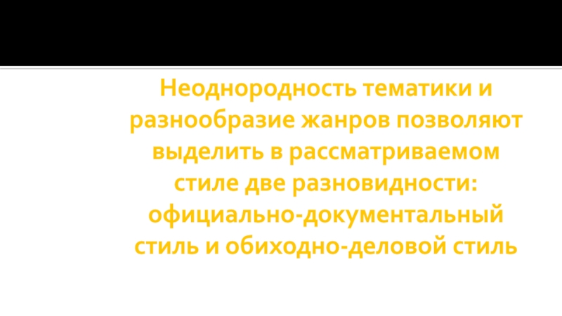 Неоднородность тематики и разнообразие жанров позволяют выделить в рассматриваемом стиле две разновидности: официально-документальный стиль и обиходно-деловой стиль