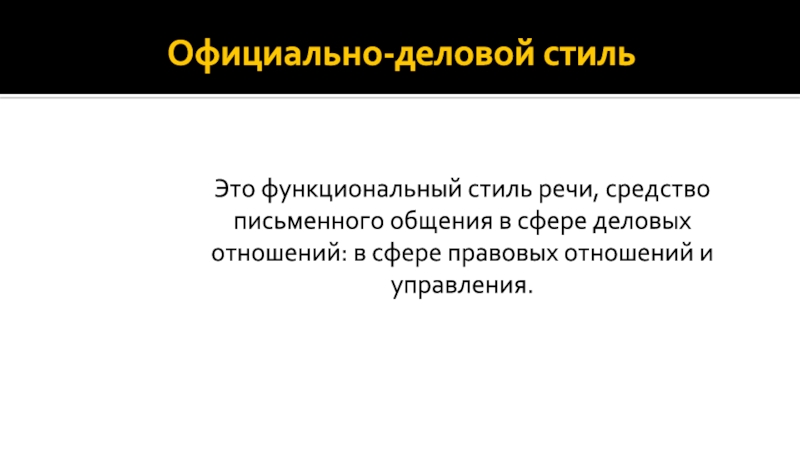 Официально-деловой стиль Это функциональный стиль речи, средство письменного общения в сфере деловых отношений: в сфере правовых отношений и управления.