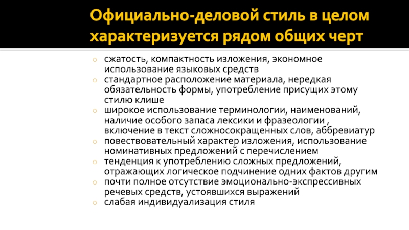 Официально-деловой стиль в целом характеризуется рядом общих чертсжатость, компактность изложения, экономное использование языковых средствстандартное расположение материала, нередкая