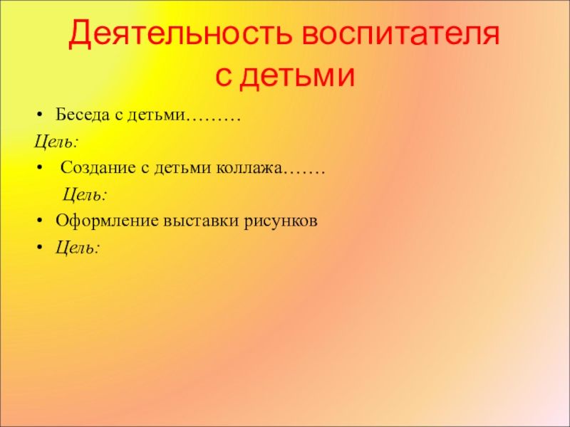 Деятельность воспитателя  с детьми Беседа с детьми………Цель: Создание с детьми коллажа…….   Цель:Оформление выставки рисунков