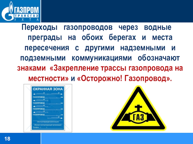 с другими надземными и подземными коммуникациями обозначают знаками «Закрепление трассы газопровода на местности» и «Осторожно! Газопровод».