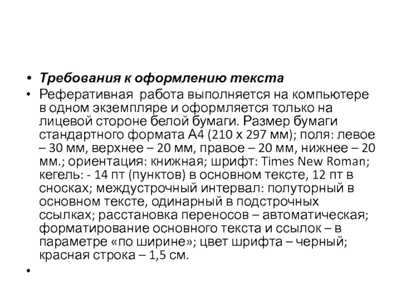 бумаги стандартного формата А4 (210 х 297 мм); поля: левое – 30 мм, верхнее – 20 мм, правое – 20 мм, нижнее – 20 мм.; ориентация: книжная; шрифт: Times New Roman; кегель: - 14 пт (пунктов) в основном тексте, 12 пт в сносках; междустрочный интервал: полуторный в основном тексте, одинарный в подстрочных ссылках; расстановка переносов – автоматическая; форматирование основного текста и ссылок – в параметре «по ширине»; цвет шрифта – черный; красная строка – 1,5 см.