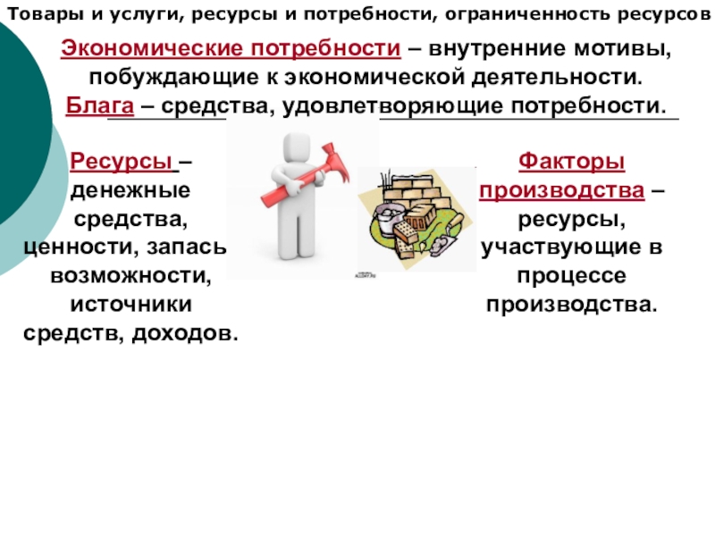Экономические потребности – внутренние мотивы, побуждающие к экономической деятельности. Блага – средства, удовлетворяющие потребности.