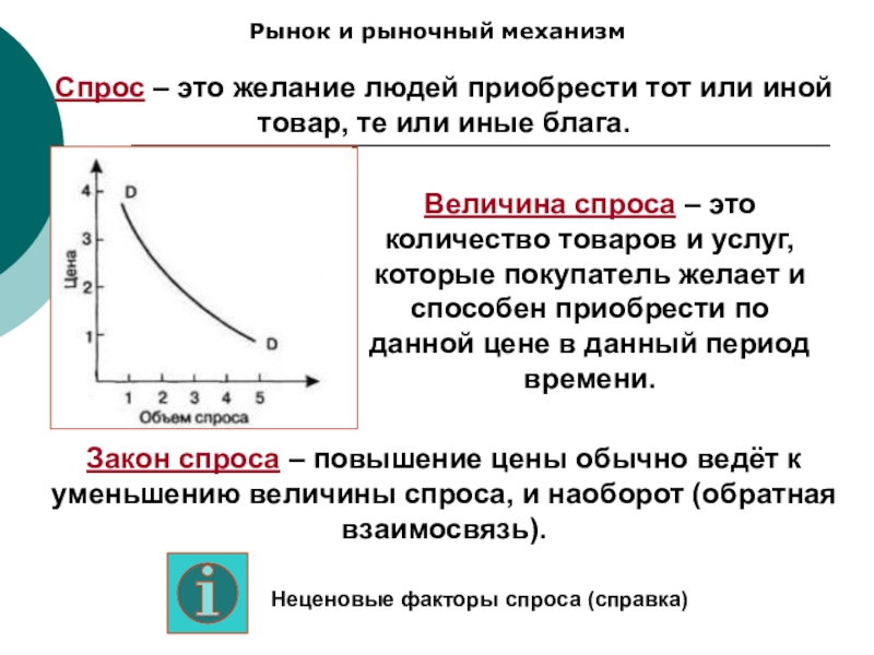Закон спроса – повышение цены обычно ведёт к уменьшению величины спроса, и наоборот (обратная взаимосвязь).