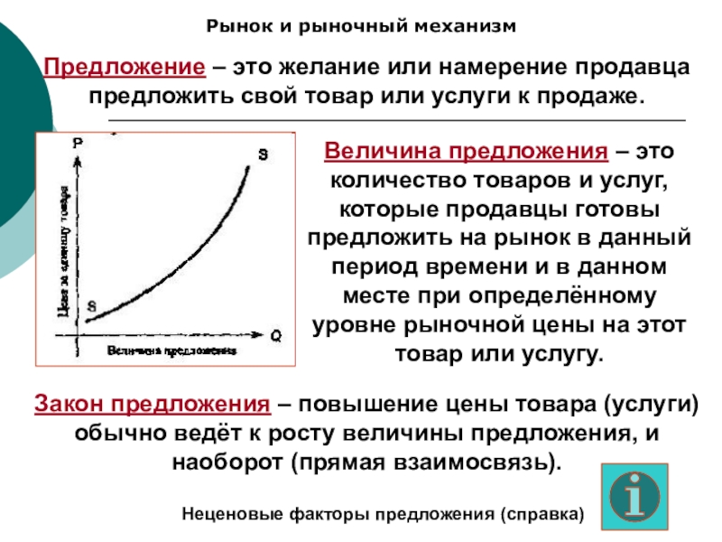 Закон предложения – повышение цены товара (услуги) обычно ведёт к росту величины предложения, и наоборот (прямая взаимосвязь).