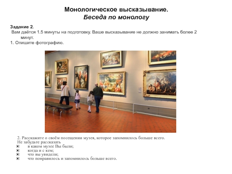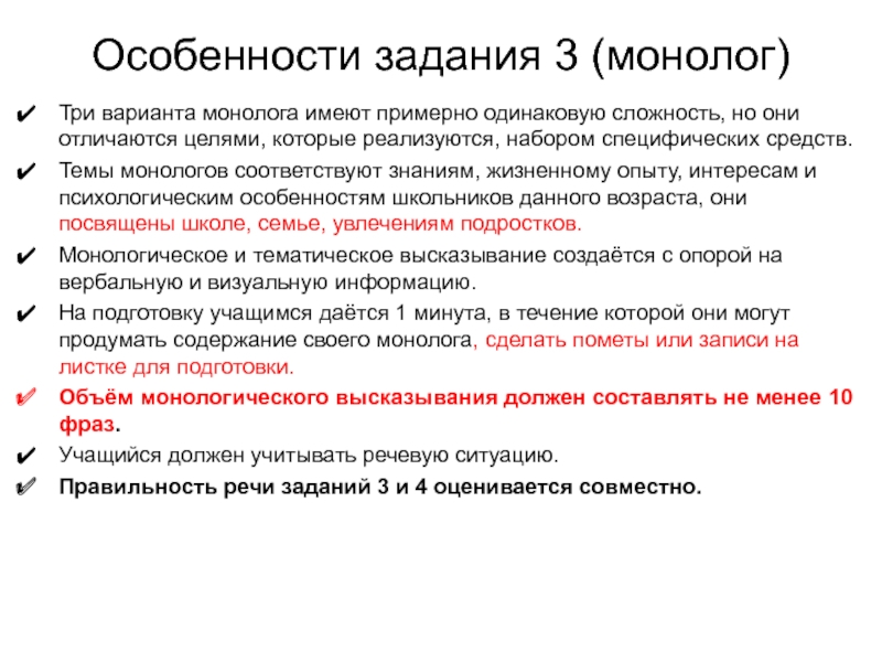 В задании 3 предлагается выбрать один из трёх предложенных вариантов беседы: описание фотографии, повествование на основе жизненного опыта, рассуждение по одной из сформулированных проблем.. Время на подготовку – 1 минута.