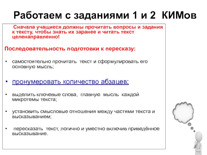 Учащийся, выполняя задание 1, уже обращался к данному тексту, работал с его содержанием, поэтому при подготовке к пересказу должен сосредоточиться на анализе высказывания и включении его в свой текст.