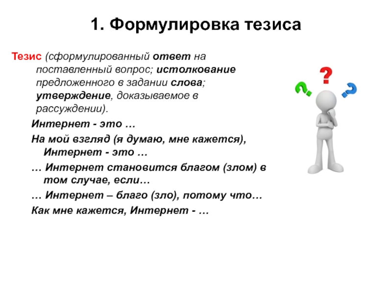 Тезис (сформулированный ответ на поставленный вопрос; истолкование предложенного